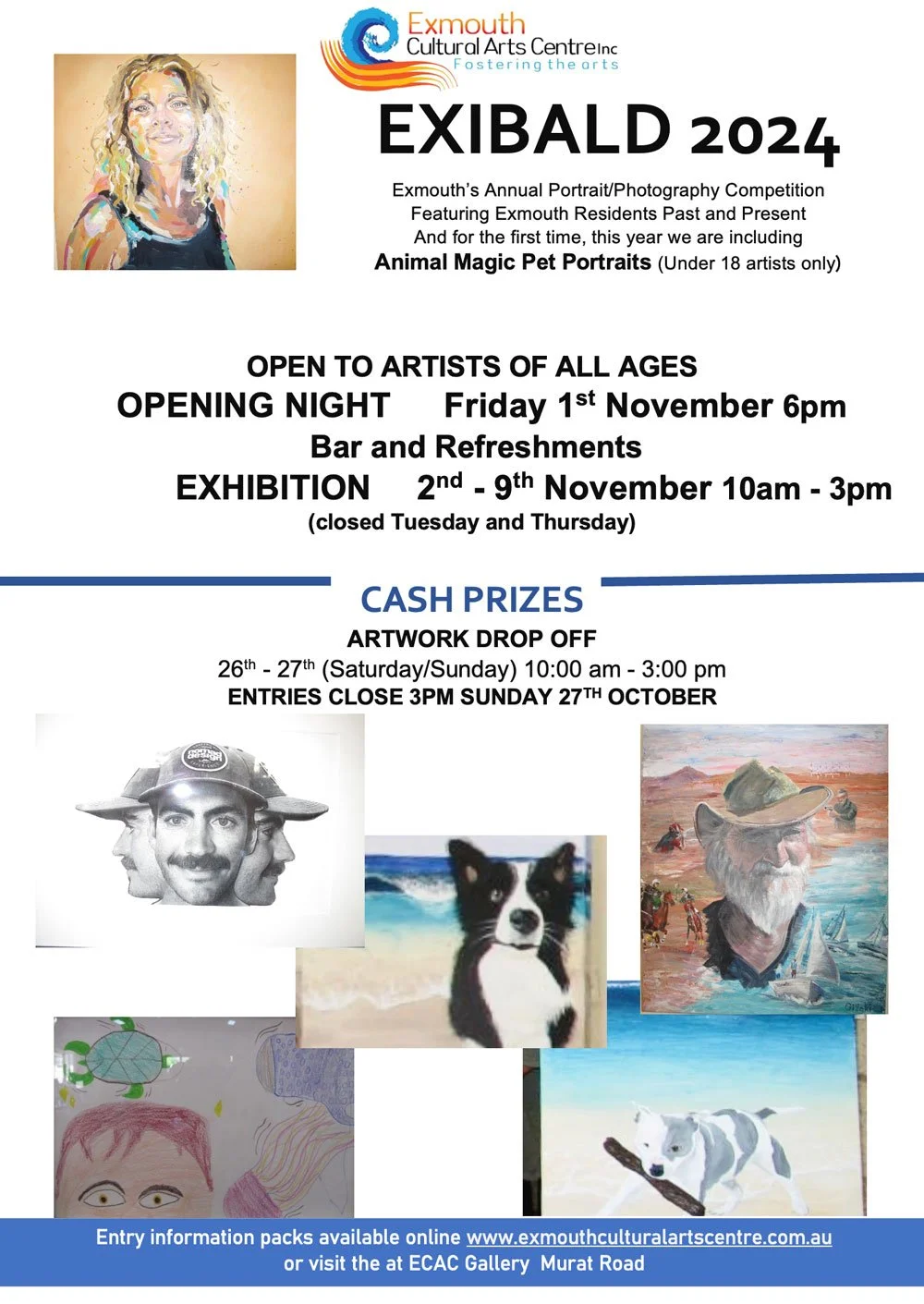 Exibald Annual Portrait Competiton EXHIBITION Saturday 2 November 2024 10:00 am 10:00 Saturday 9 November 2024 3:00 pm 15:00 Exmouth Cultural Arts Centre Murat Road Exmouth, WA, 6707 Australia (map) Google Calendar ICS Exibald Annual Portrait CompetitonEXHIBITION: SATURDAY 2ND - 9TH NOVEMBER 2024